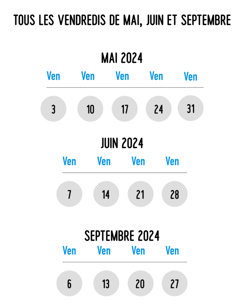 Ces journées se déroulent TOUS LES VENDREDIS en mai, juin et septembre, voir le calendrier ci dessous :